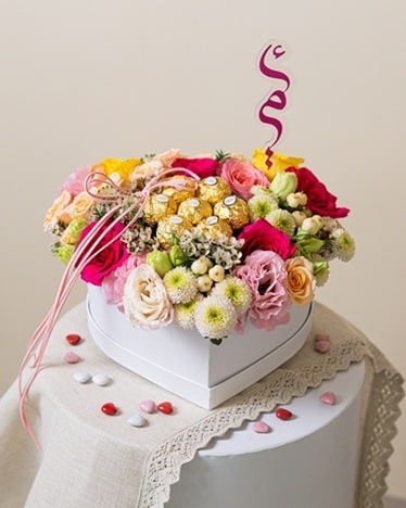 A charming and elegant floral arrangement for Mother’s Day, filled with an array of roses, and chocolates, carefully arranged to show your love and make her feel extra special.
