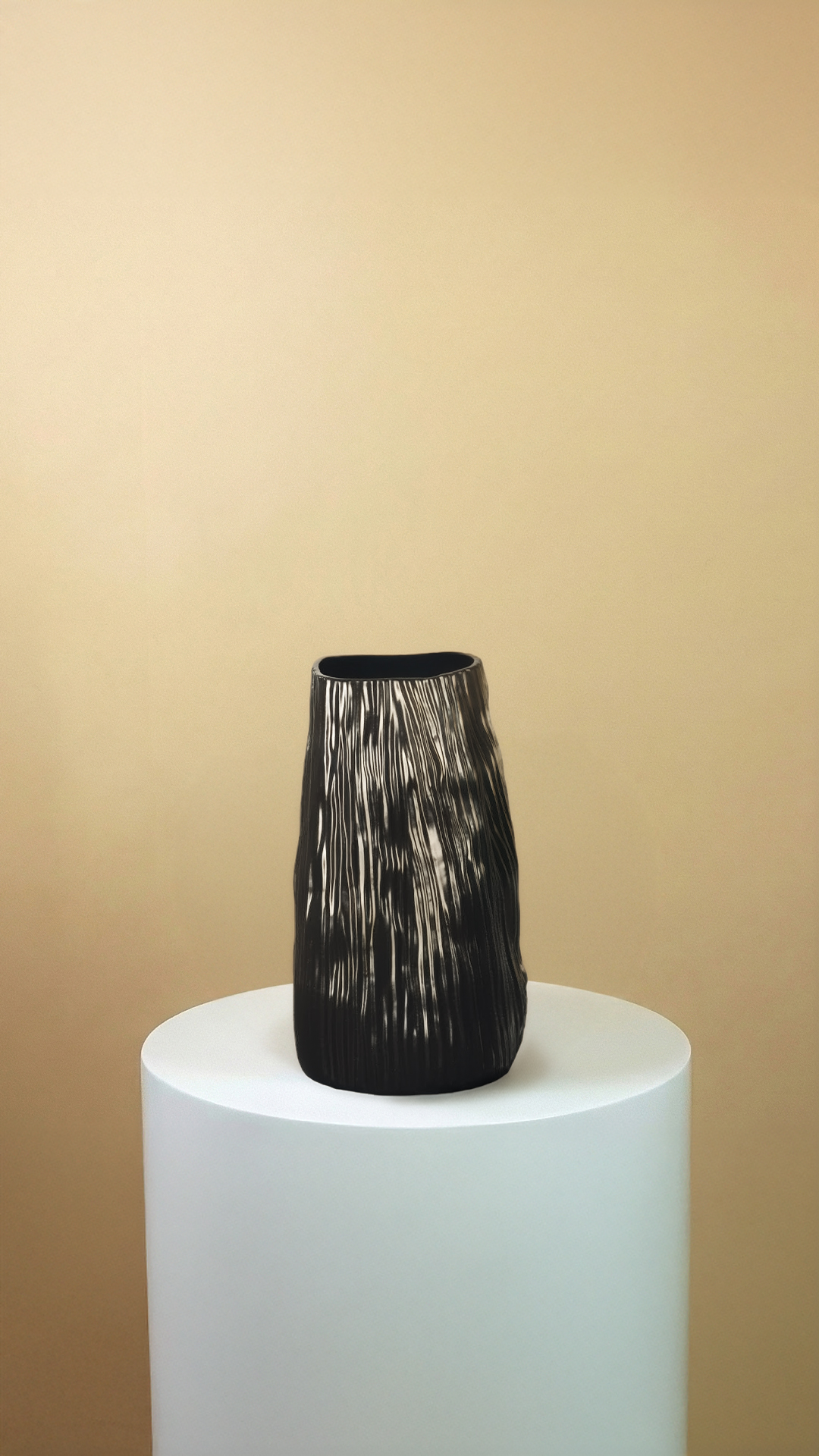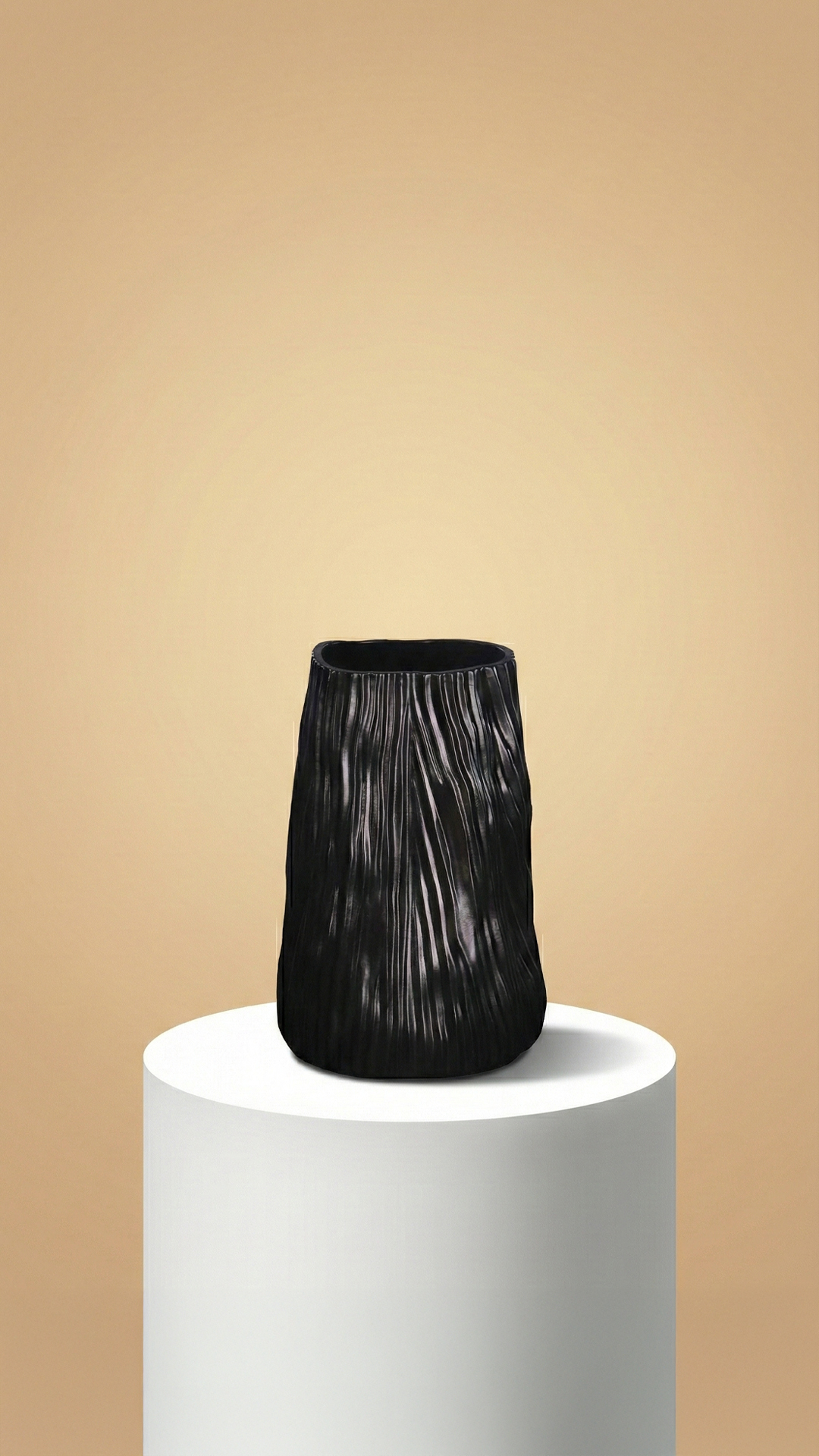 A sculptural ceramic vase with a tall, fluid form and a deep black finish, accented by subtle vertical textures for a bold yet refined statement.