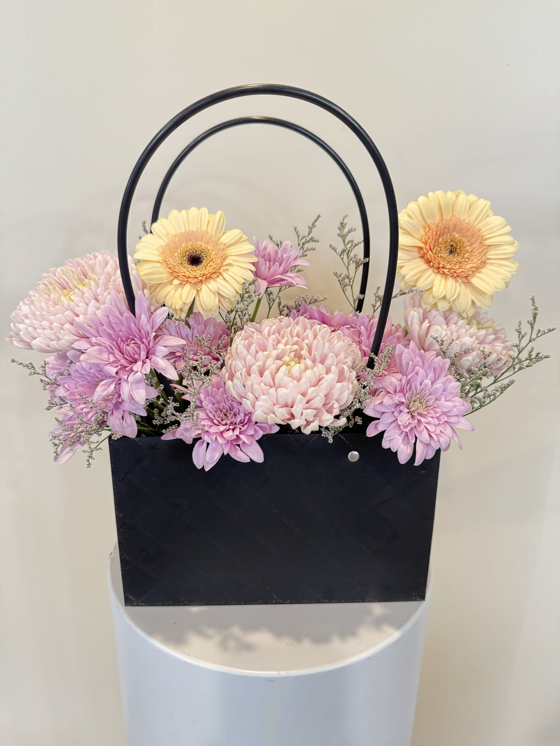 A graceful blend of soft blush and pastel blooms arranged in a chic black tote. Elegant and versatile, perfect for any occasion from celebrations to thoughtful surprises.