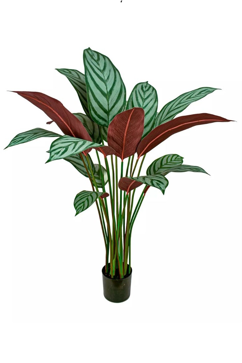 Bring vibrant, exotic flair to your space with this wonderful 110cm Artificial Calathea Freddie Bush. Crafted from an innovative water-repellent textile enhanced with cellulose, this lifelike plant features wide leaves adorned with a clear, high-quality white and green pattern. For an authentic touch, the reverse side of the foliage reveals a striking purple hue. Designed with removable, interchangeable leaves that contain flexible wire, you can effortlessly swap their placement and shape the bush to your precise preference. It comes securely set in a standard pot, ready to elevate your interior design without any of the typical Calathea maintenance!