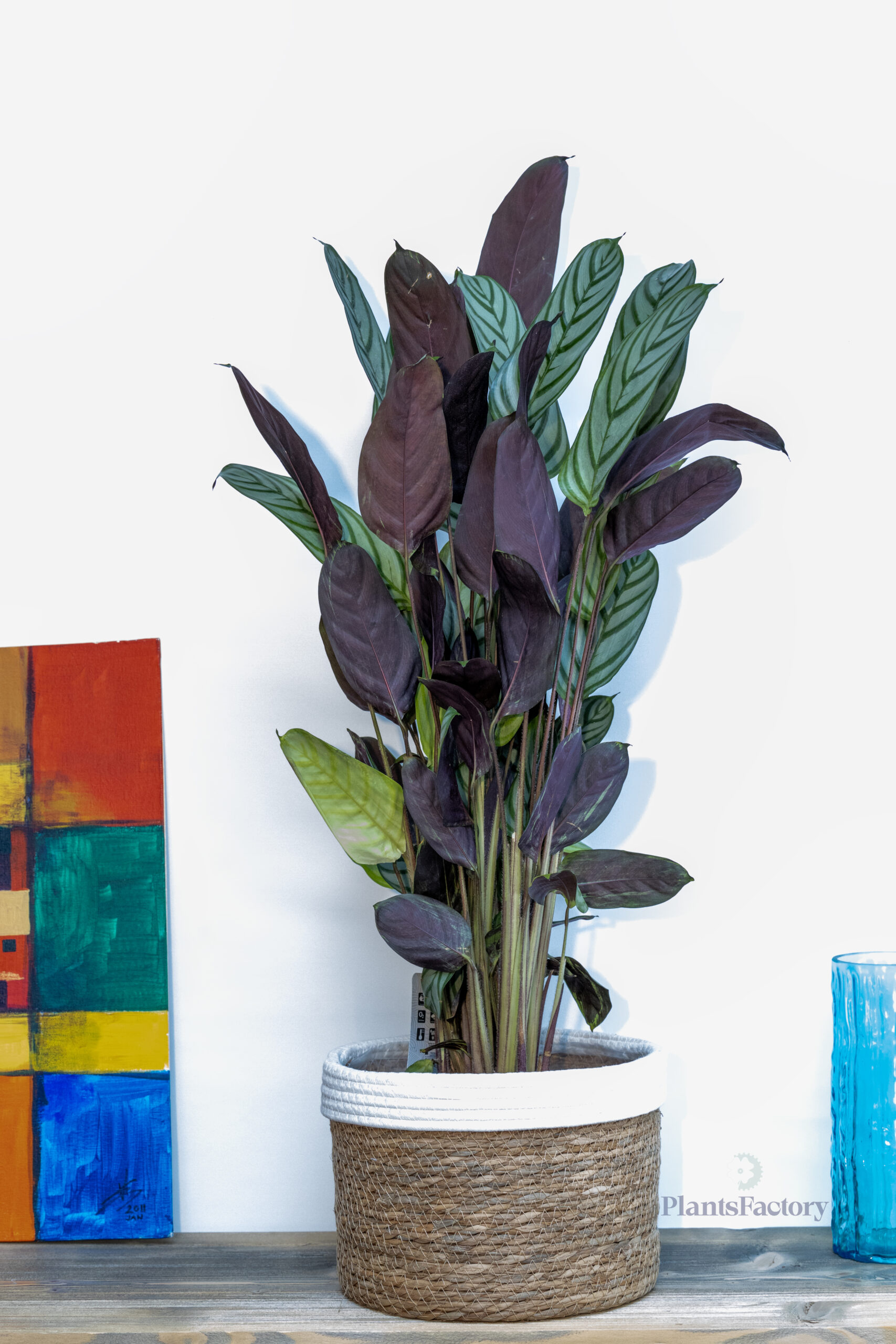 Calathea oppenheimiana, also known as the Giant Calathea, is a stunning tropical plant with large, elongated leaves marked by unique patterns. This plant grows up to 100 cm, making it ideal for adding height and lush greenery to indoor spaces. Its vibrant foliage, featuring green and silver patterns on top with purple undersides, adds dramatic flair to any room.