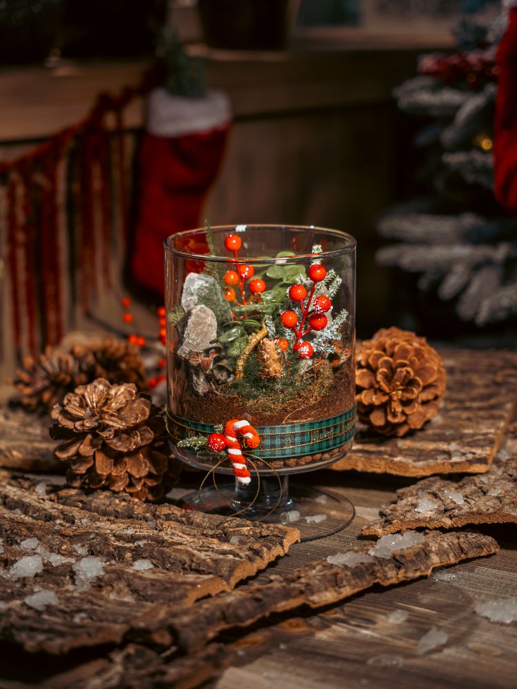 The Candy Cane Mini Christmas Terrarium is a tiny winter world in a glass cylinder: succulents, moss, stones, berries, a pinecone and candy cane details, finished with a festive ribbon. Perfect as a desk accessory, teacher’s gift or small thank-you present in Abu Dhabi and Dubai.