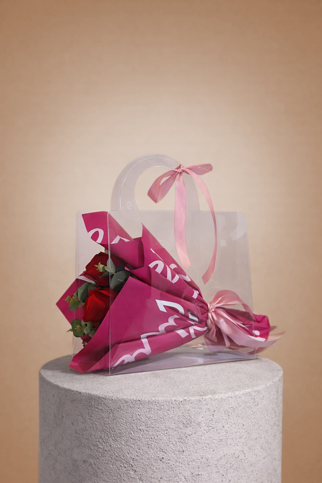 A striking artificial red rose arrangement wrapped in bold pink paper and presented in a sleek transparent handbag style box. A romantic keepsake designed to last beautifully beyond the moment.