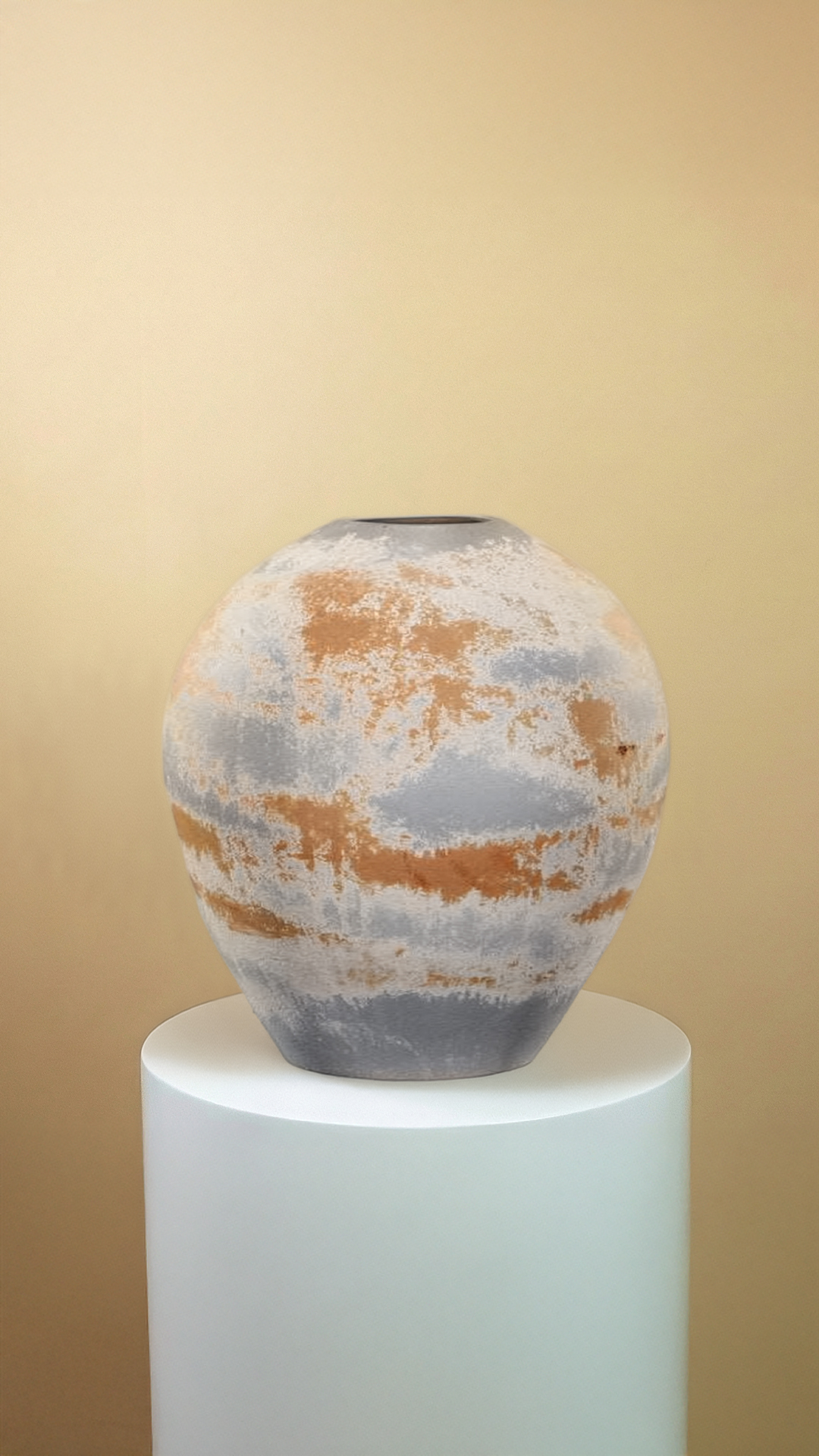 A handcrafted ceramic vase featuring a softly rounded silhouette and layered, weathered glaze. The earthy blend of warm clay and cool grey tones gives it a naturally aged, artistic character.