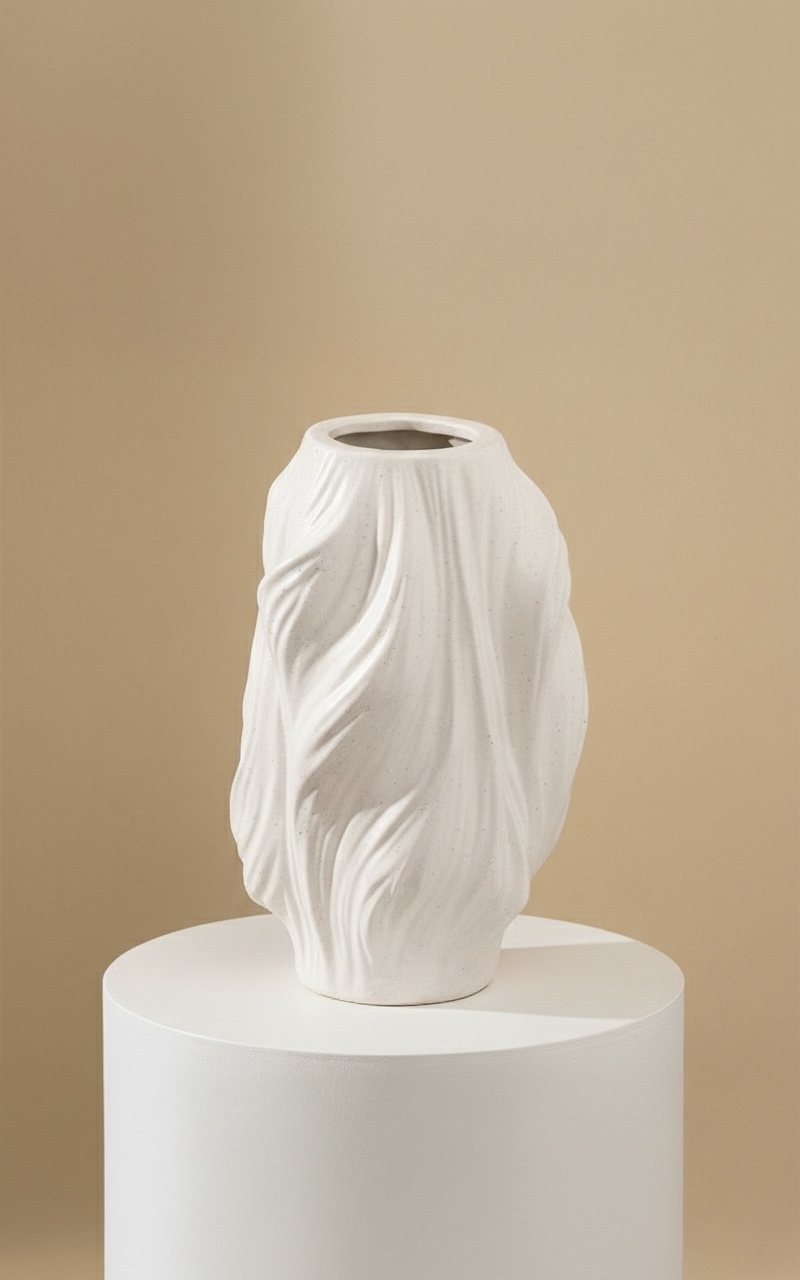 A sculptural ceramic vase defined by flowing, organic lines. Its textured surface and soft white finish create a refined statement that feels both artistic and contemporary.