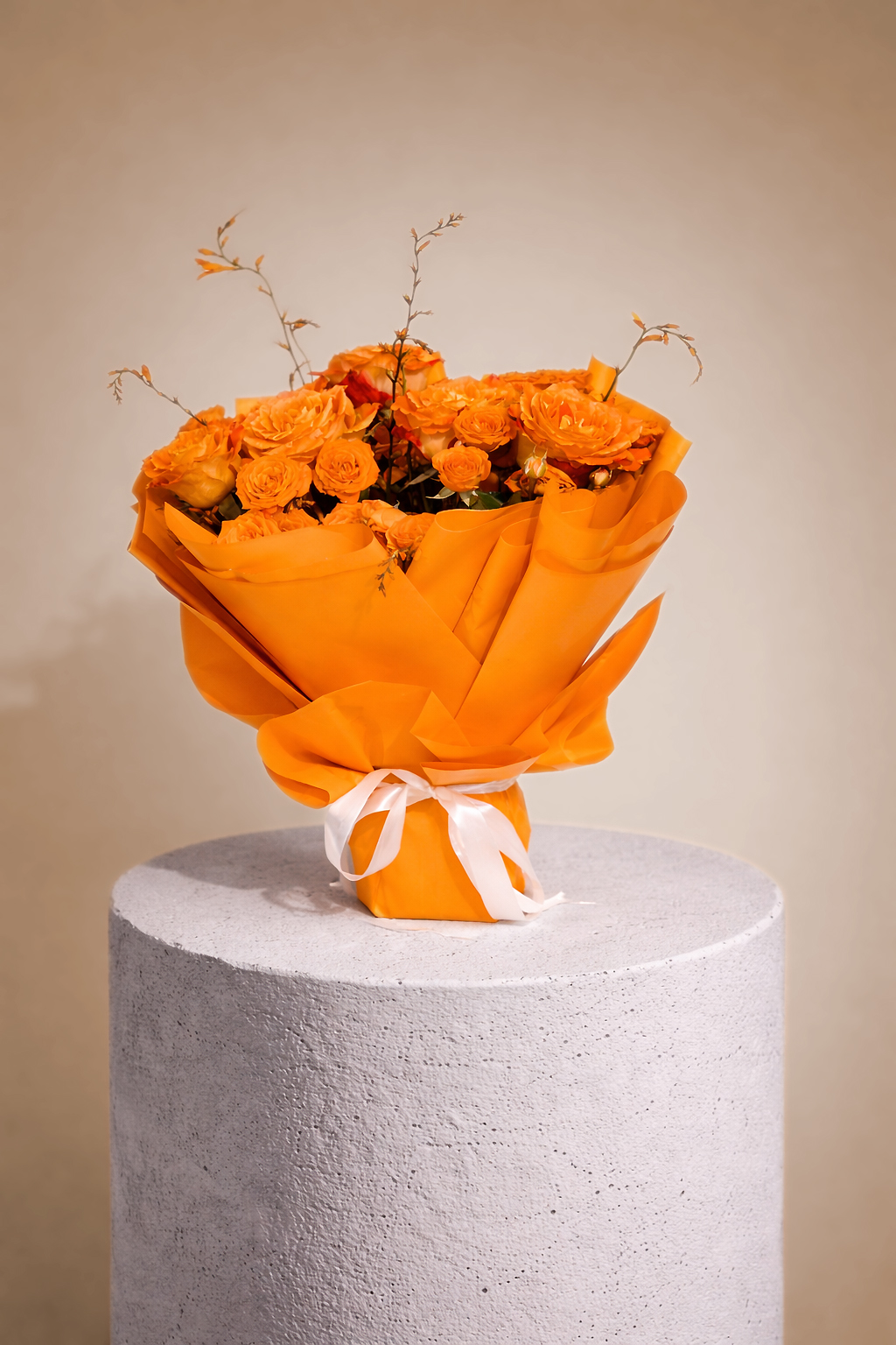 A radiant bouquet of fresh orange roses wrapped in warm golden tones, perfect for brightening moments and celebrating joyful occasions.