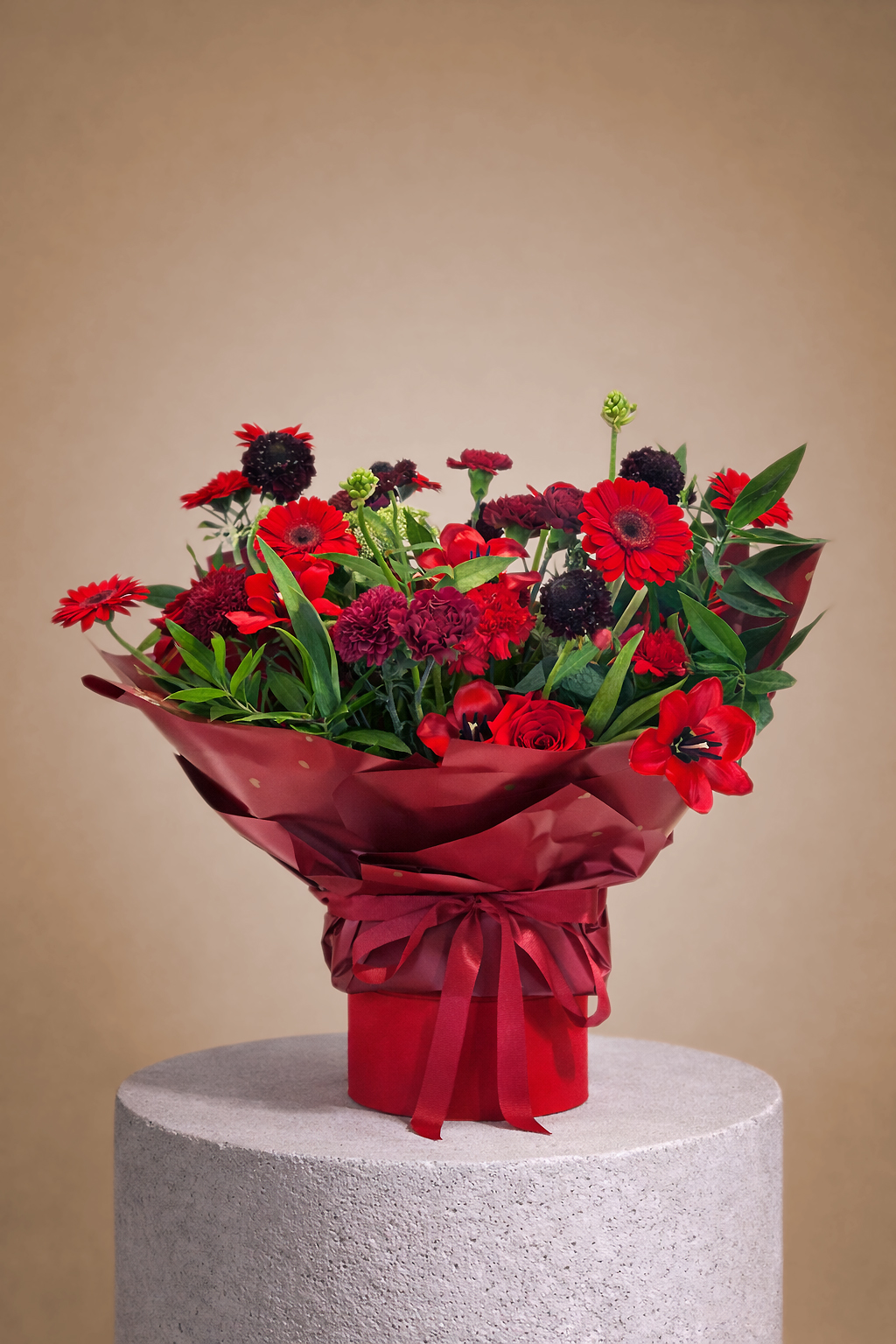 Celebrate love with this lush and vibrant Valentine’s arrangement featuring radiant red blooms in a rich mix of textures and tones. Designed in a stylish and elegant wrapping, this bouquet is a bold expression of passion and affection.