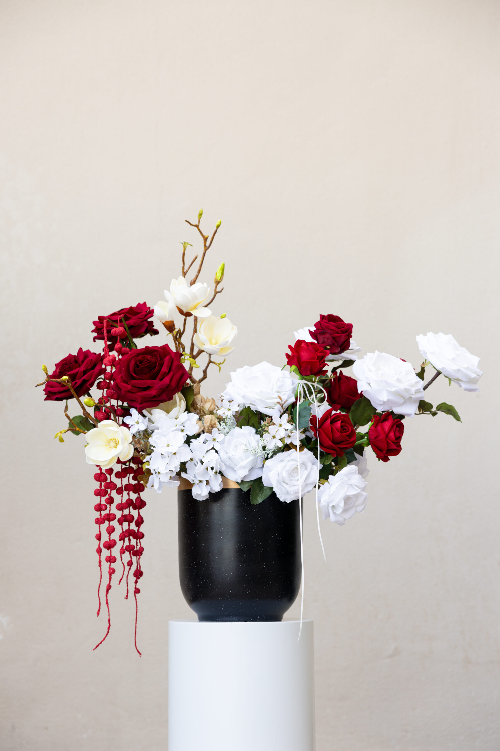 A sophisticated artificial floral arrangement blending crisp ivory blooms with deep crimson roses. Designed to elevate interiors with timeless elegance.