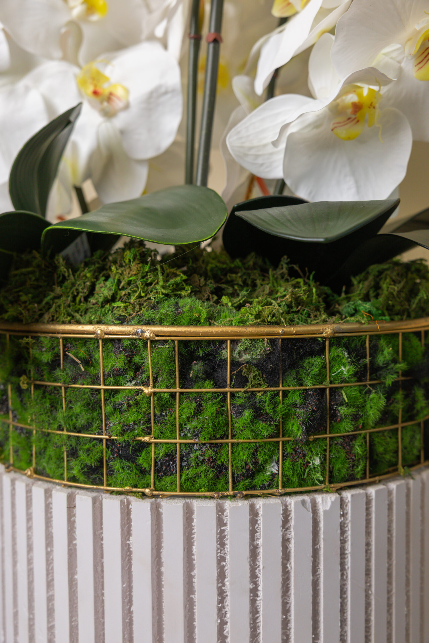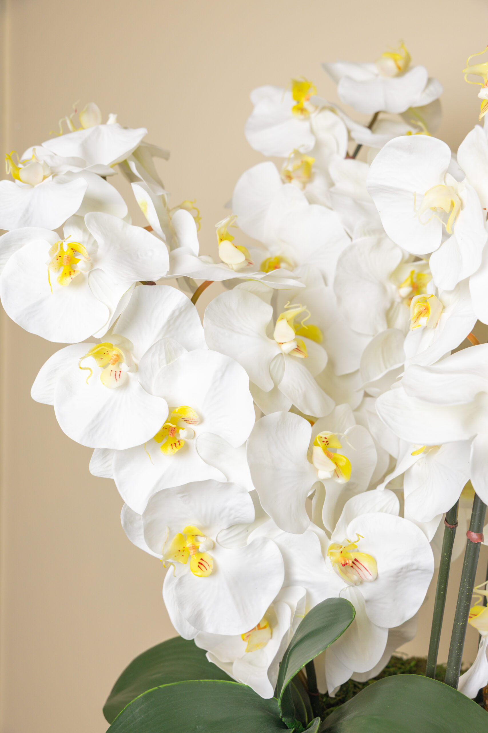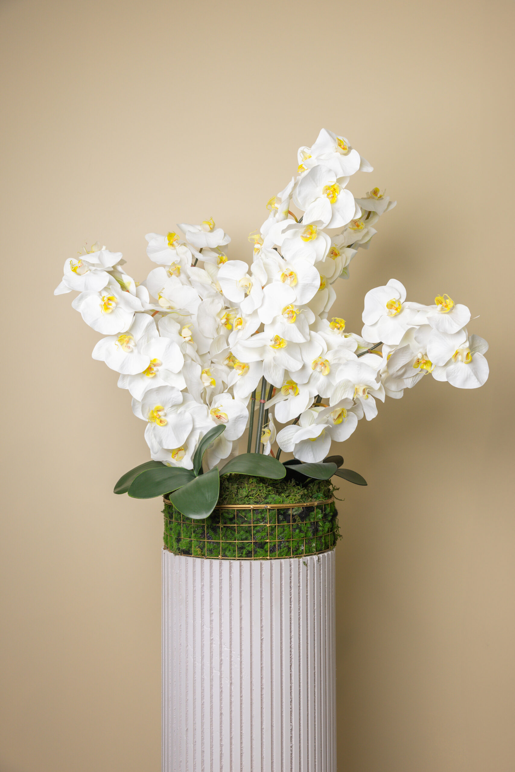 A timeless artificial arrangement of cascading white Phalaenopsis orchids, beautifully styled with lush greenery and moss in a modern pedestal vase. Designed to bring effortless elegance and lasting beauty to any interior.