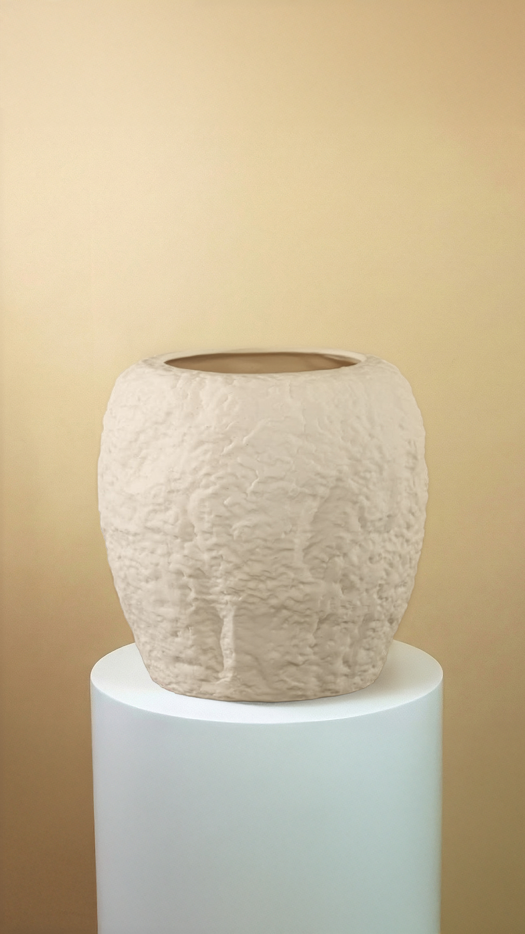 A textured ceramic vase in a soft ivory tone, inspired by natural stone formations. Its organic surface and muted palette bring warmth and understated elegance to any space.