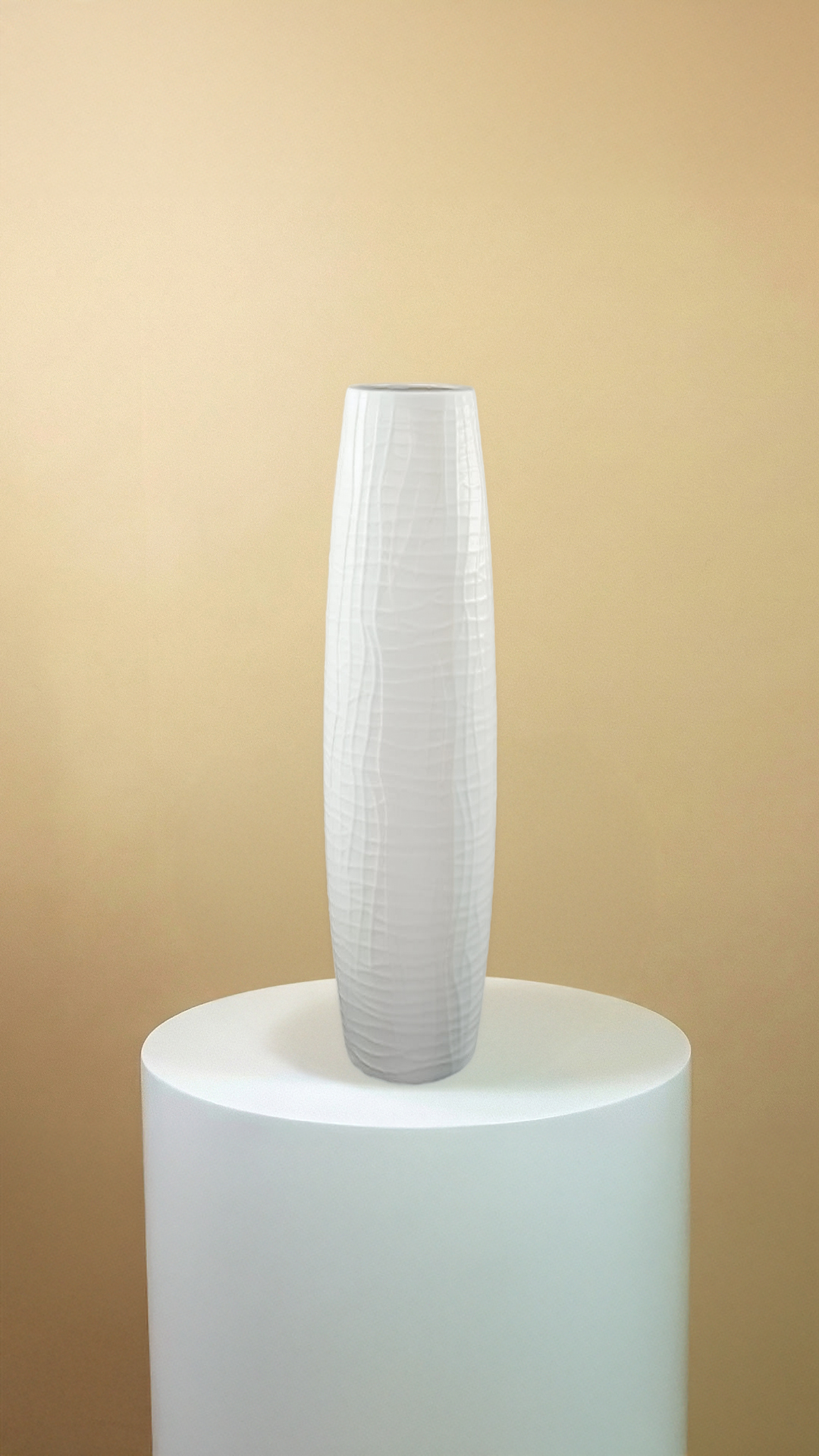 A tall ceramic vase with a clean, tapered silhouette and a soft white finish, detailed with subtle linear texture for an elegant, modern look.
