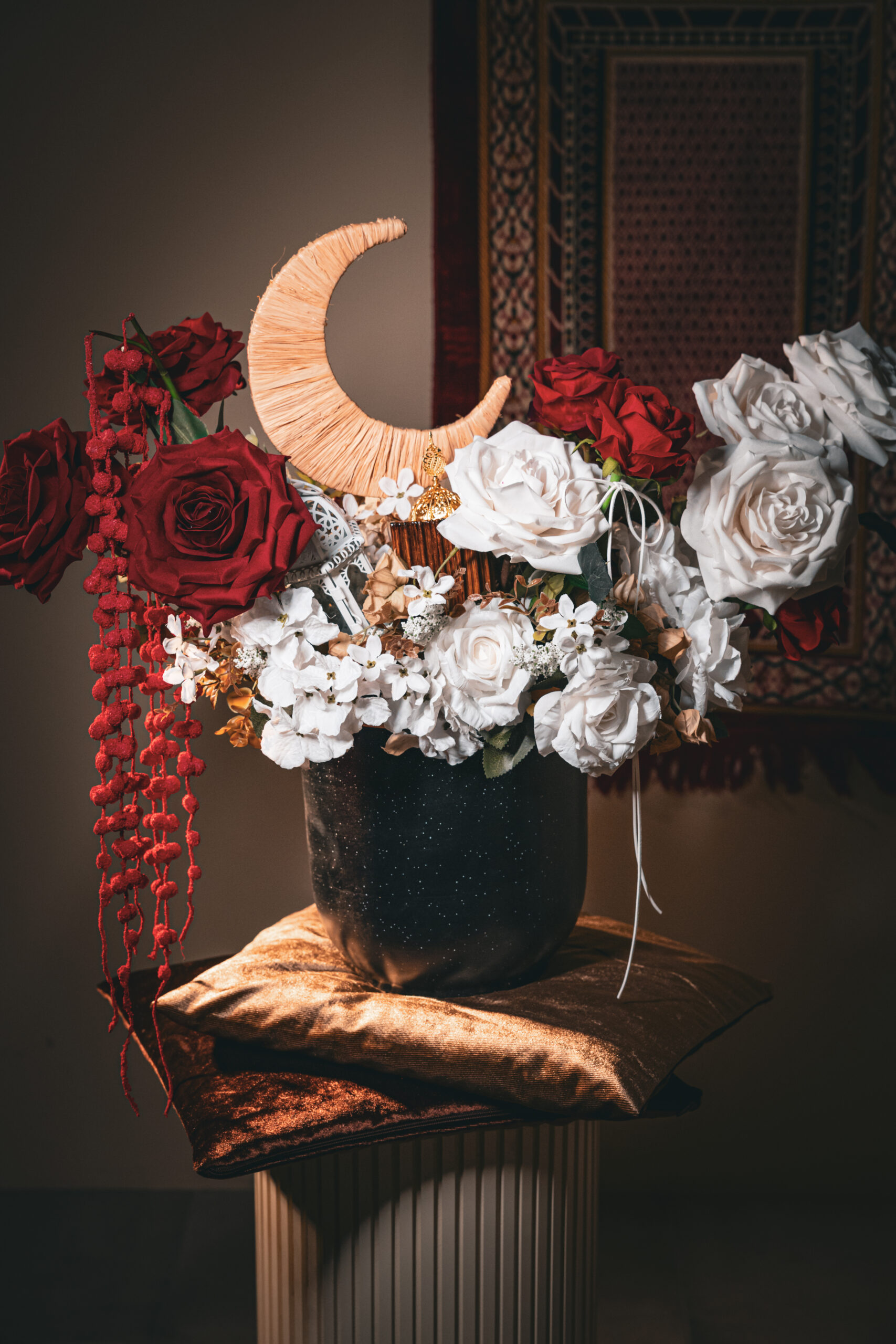 A beautifully crafted Ramadan arrangement featuring premium artificial flowers in rich red and soft white tones, accented with a symbolic crescent moon. Designed for lasting elegance with no maintenance.