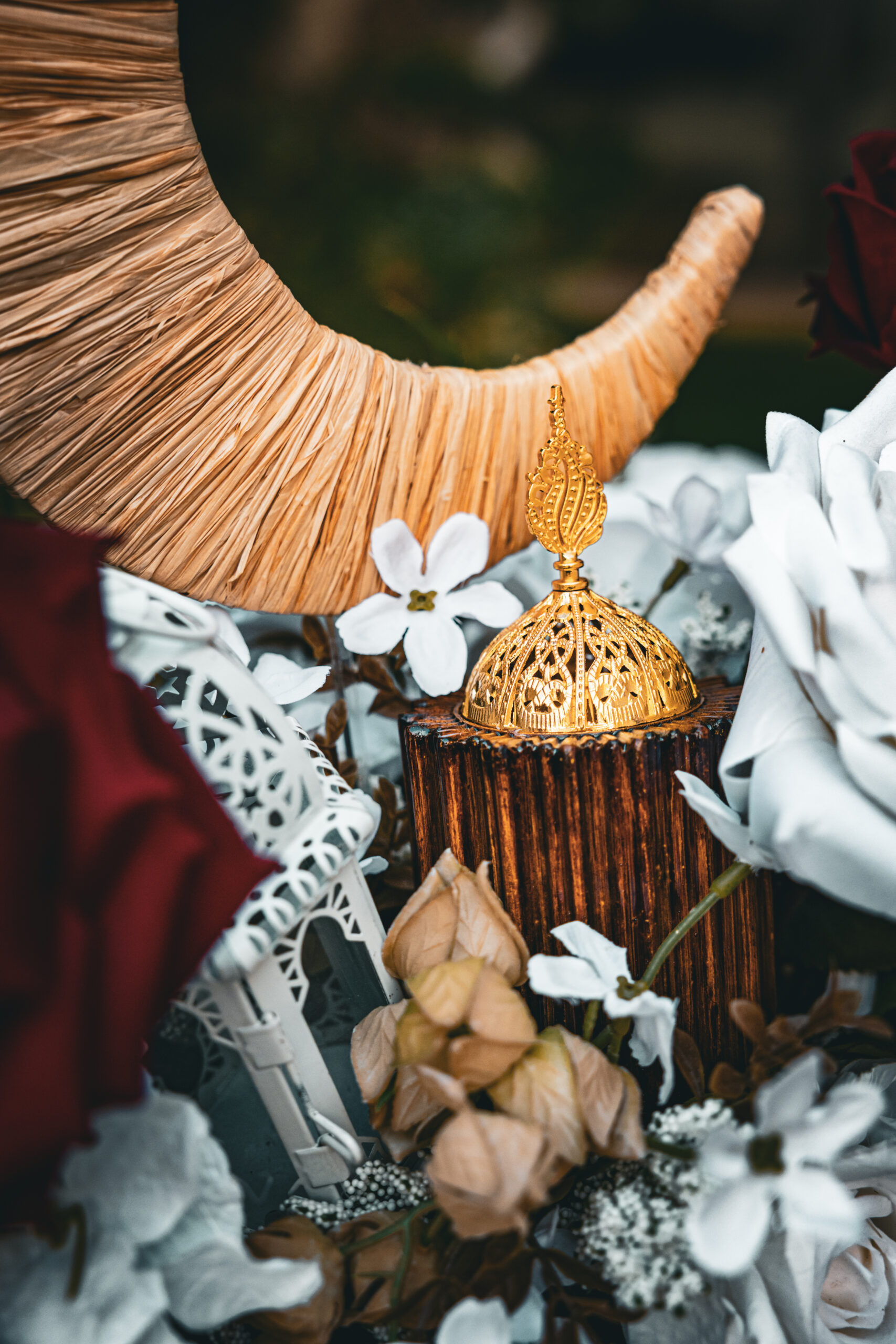 Elegant Ramadan flower arrangement with crescent moon accents.