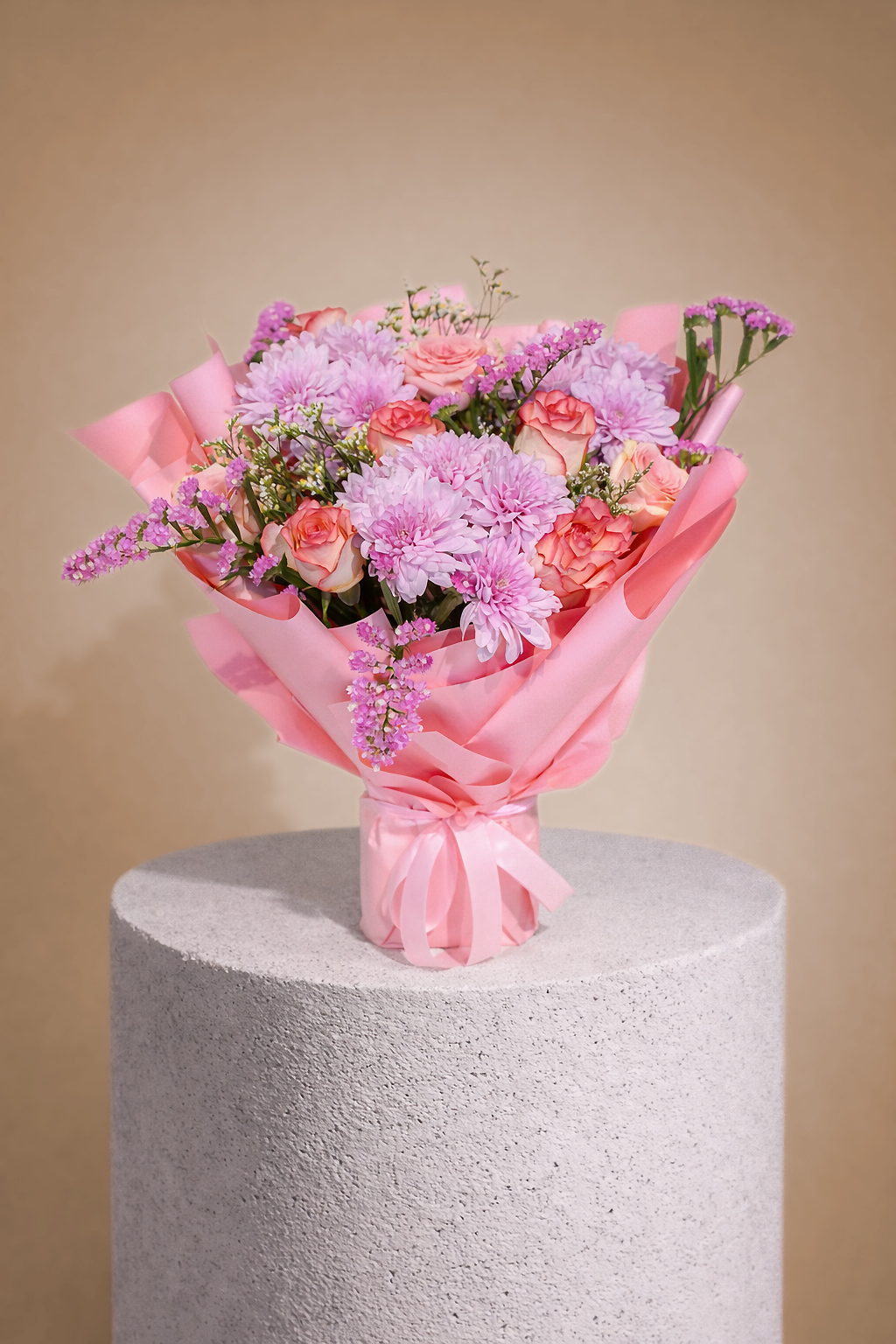 A soft and romantic bouquet featuring fresh pink roses and delicate pastel blooms, wrapped in elegant pink tones. Perfect for sweet gestures, celebrations, and heartfelt moments.