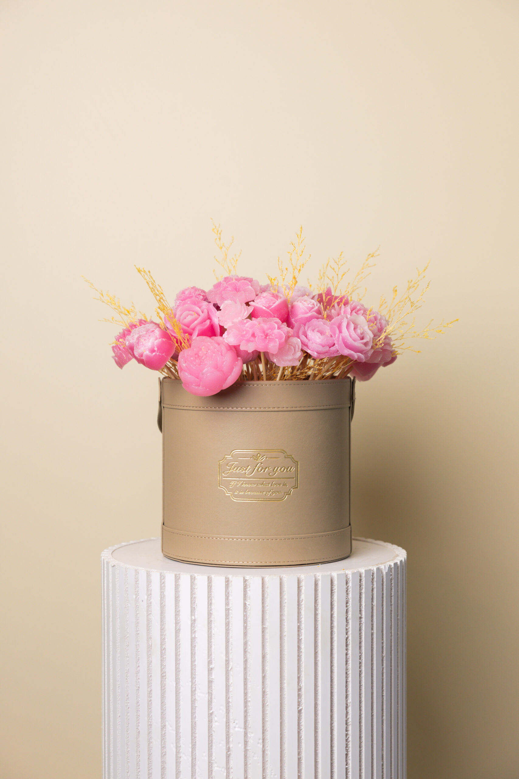 A graceful candle arrangement surrounded by soft pink blooms and delicate golden accents, designed to add warmth and elegance to any space. A timeless gift that suits every occasion.