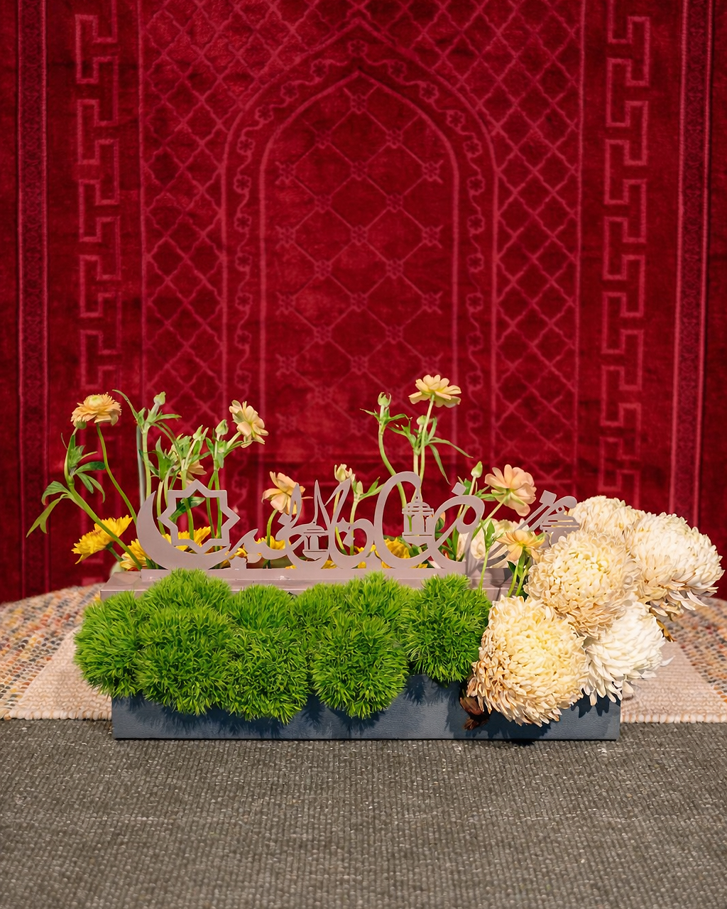 A refreshing Ramadan centerpiece featuring vibrant green dianthus, soft ivory chrysanthemums, and cheerful seasonal blooms, beautifully accented with an elegant Eid Mubarak crescent décor. A graceful and meaningful touch for your iftar table.