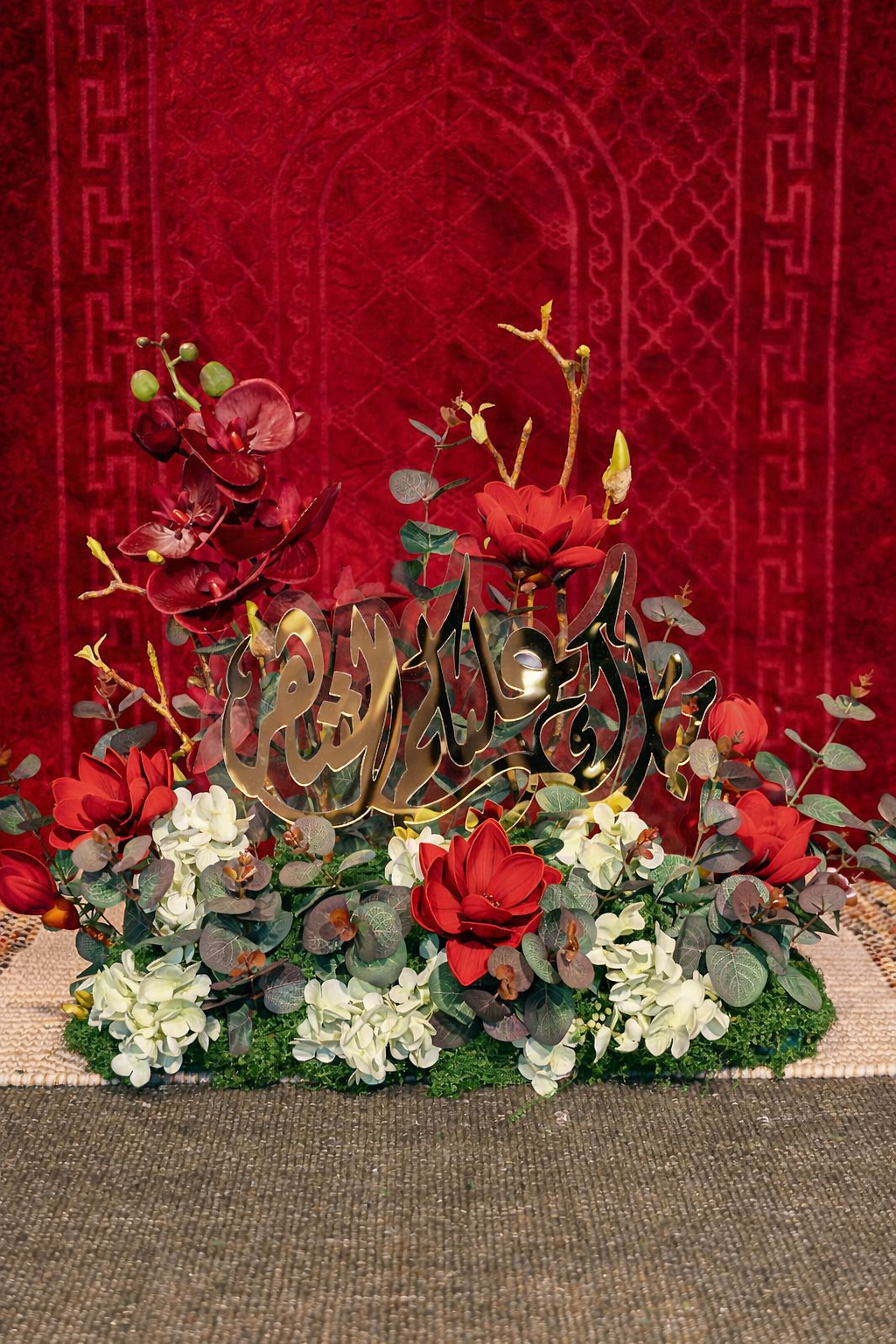A luxurious artificial floral arrangement in rich red and soft ivory tones, beautifully accented with elegant Arabic calligraphy. A meaningful and lasting centerpiece to celebrate the spirit of Ramadan.