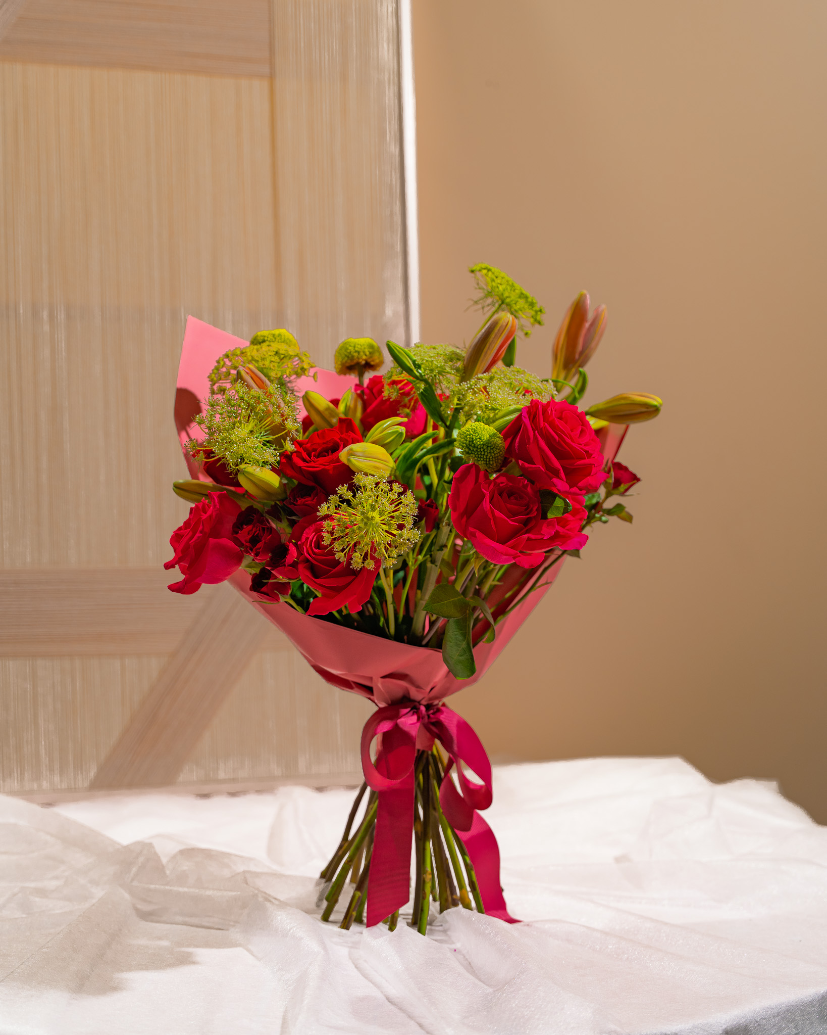 - Seasonal green filler flowers (dill/queen anne style)