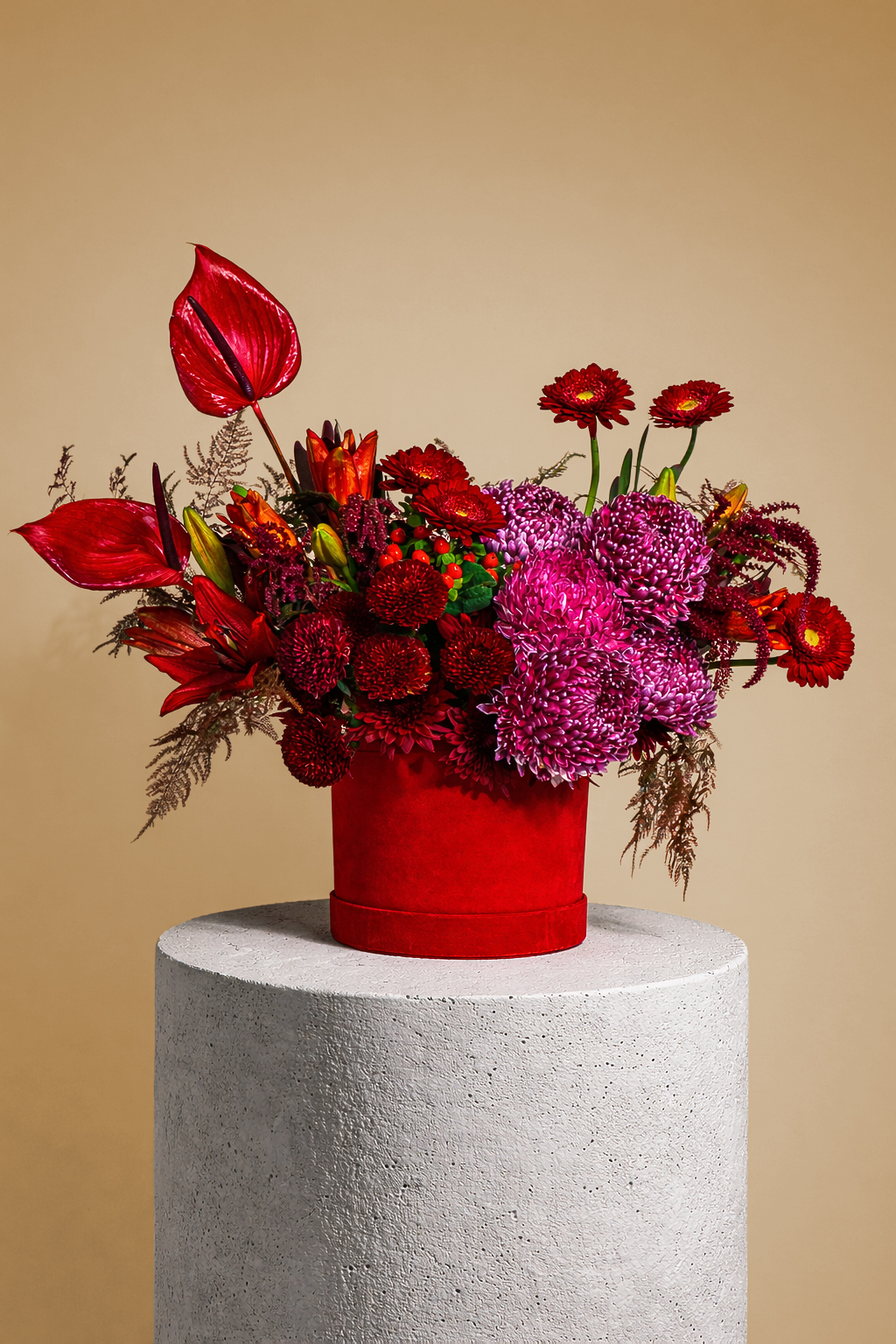 A luxurious fresh flower arrangement featuring bold red blooms and vibrant purple chrysanthemums, beautifully styled in a velvet red box for a romantic and elegant Valentine’s statement.