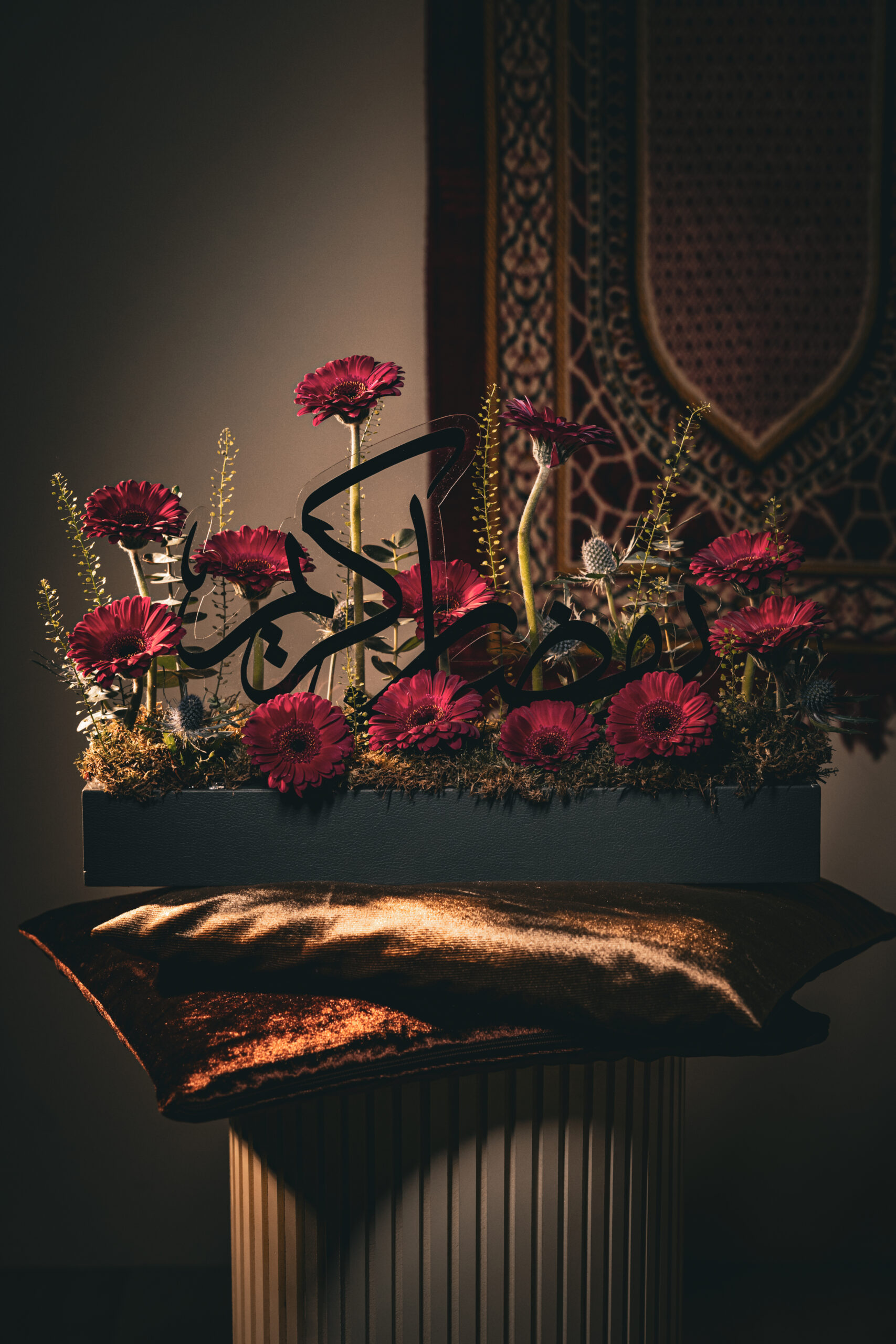 A luxurious Ramadan floral arrangement featuring rich burgundy blooms and elegant Arabic calligraphy. Designed to bring warmth, beauty, and a festive spirit to your space, this arrangement is perfect for home décor, gifting, or corporate displays during the holy month.