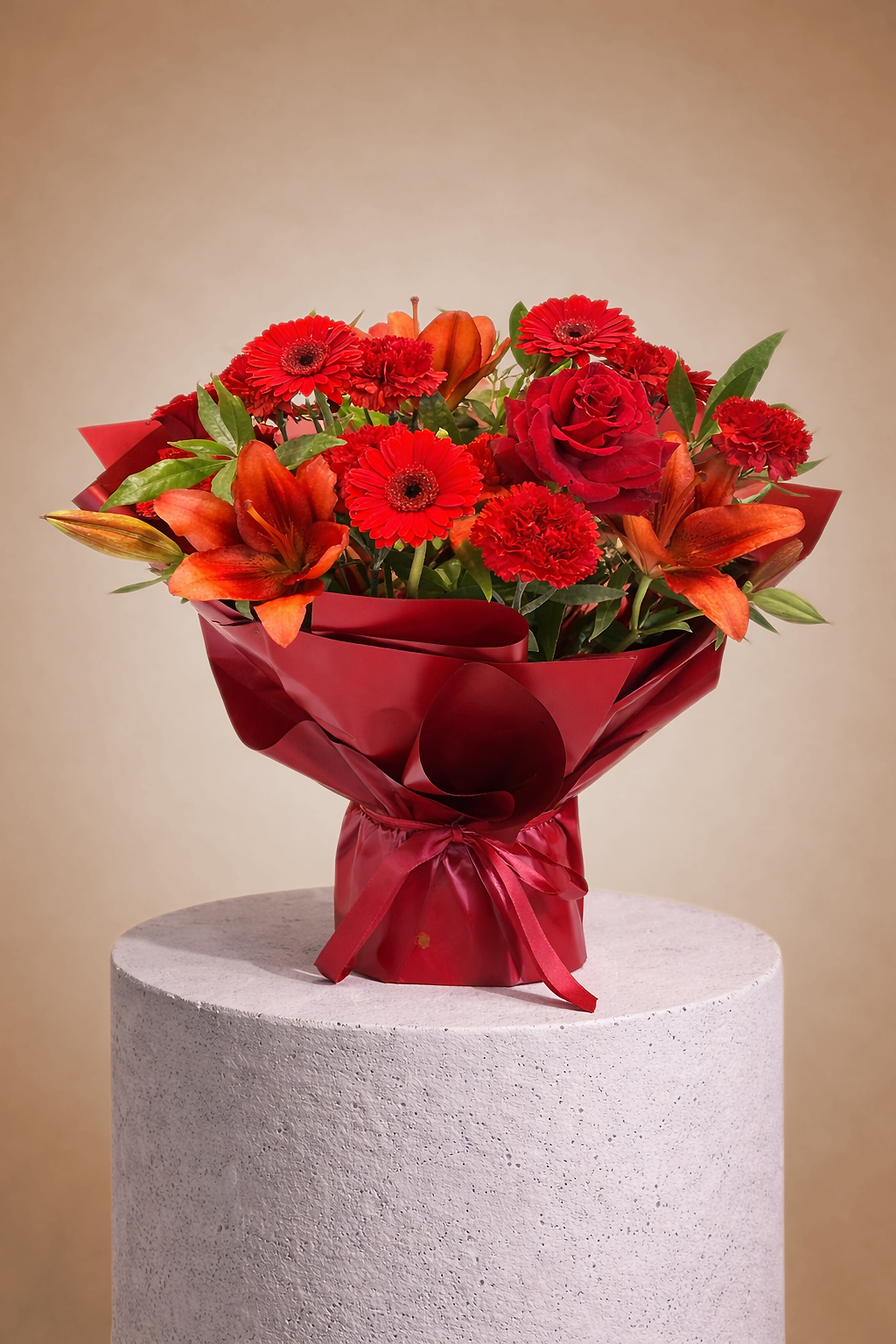 Ignite the moment with Scarlet Passion, a striking Valentine’s bouquet featuring radiant red roses, vibrant gerberas and elegant lilies wrapped in luxurious red packaging. Rich in color and texture, this arrangement is designed to make a powerful romantic statement.