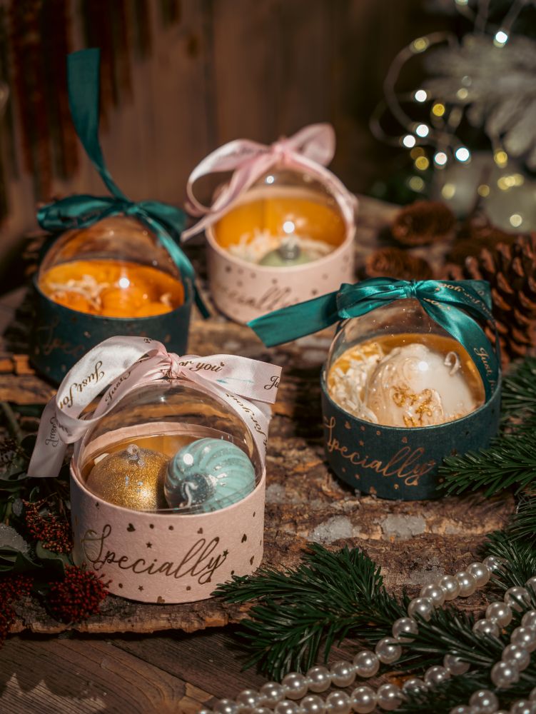 Our Snowglobe Keepsake Boxes look like tiny Christmas worlds. Each round box is topped with a clear dome and filled with elegant baubles nestled in soft shredded paper, finished with a satin bow and “Specially for you” ribbon.