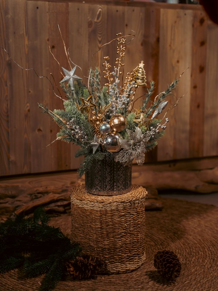The Starry Night Gold & Silver Arrangement combines frosted greenery with golden and silver stars, baubles, bells and twinkling accents in an ornate metallic pot. Designed for elegant homes and boutique spaces in Abu Dhabi and Dubai, it delivers a chic, Instagram-ready Christmas look.