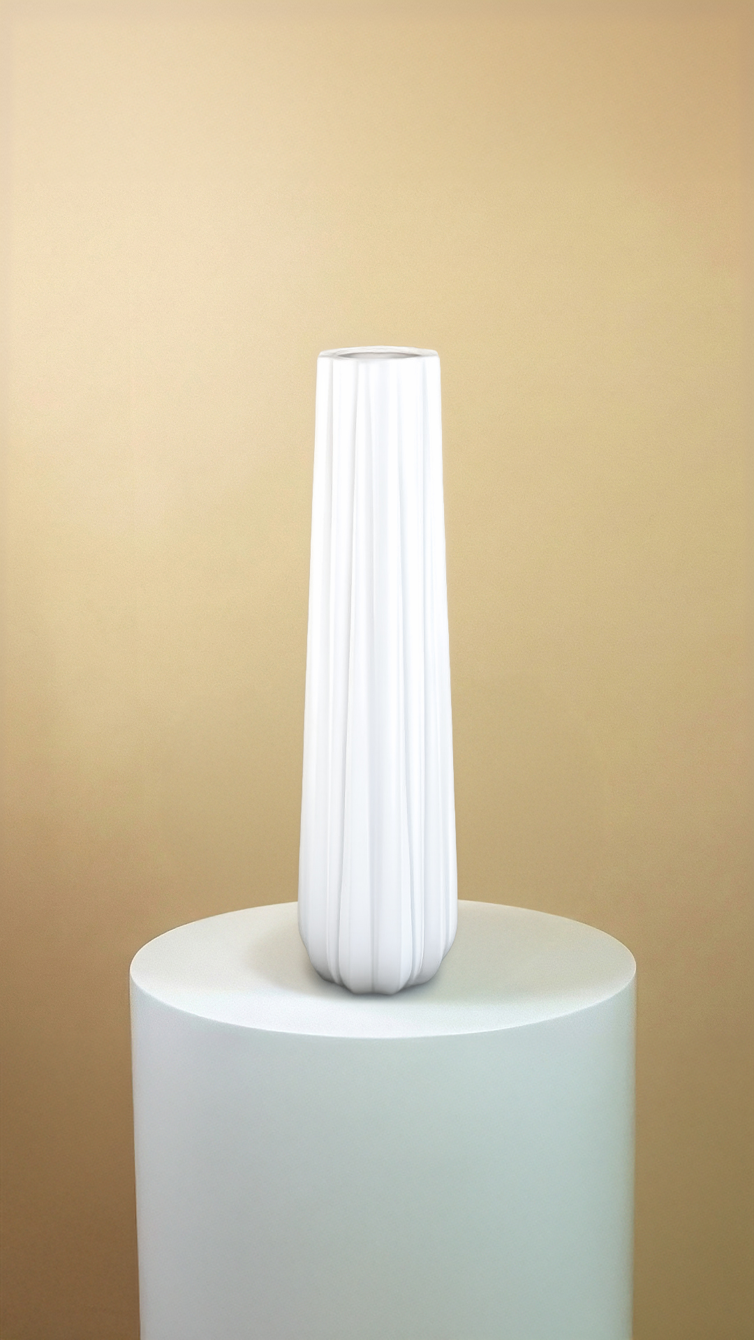 A high-quality white ceramic vase featuring a slim, elongated silhouette and subtle vertical fluting. Its smooth finish and neutral tone make it a versatile accent for modern, minimalist, and luxury interiors—beautiful on its own or styled with dried arrangements.