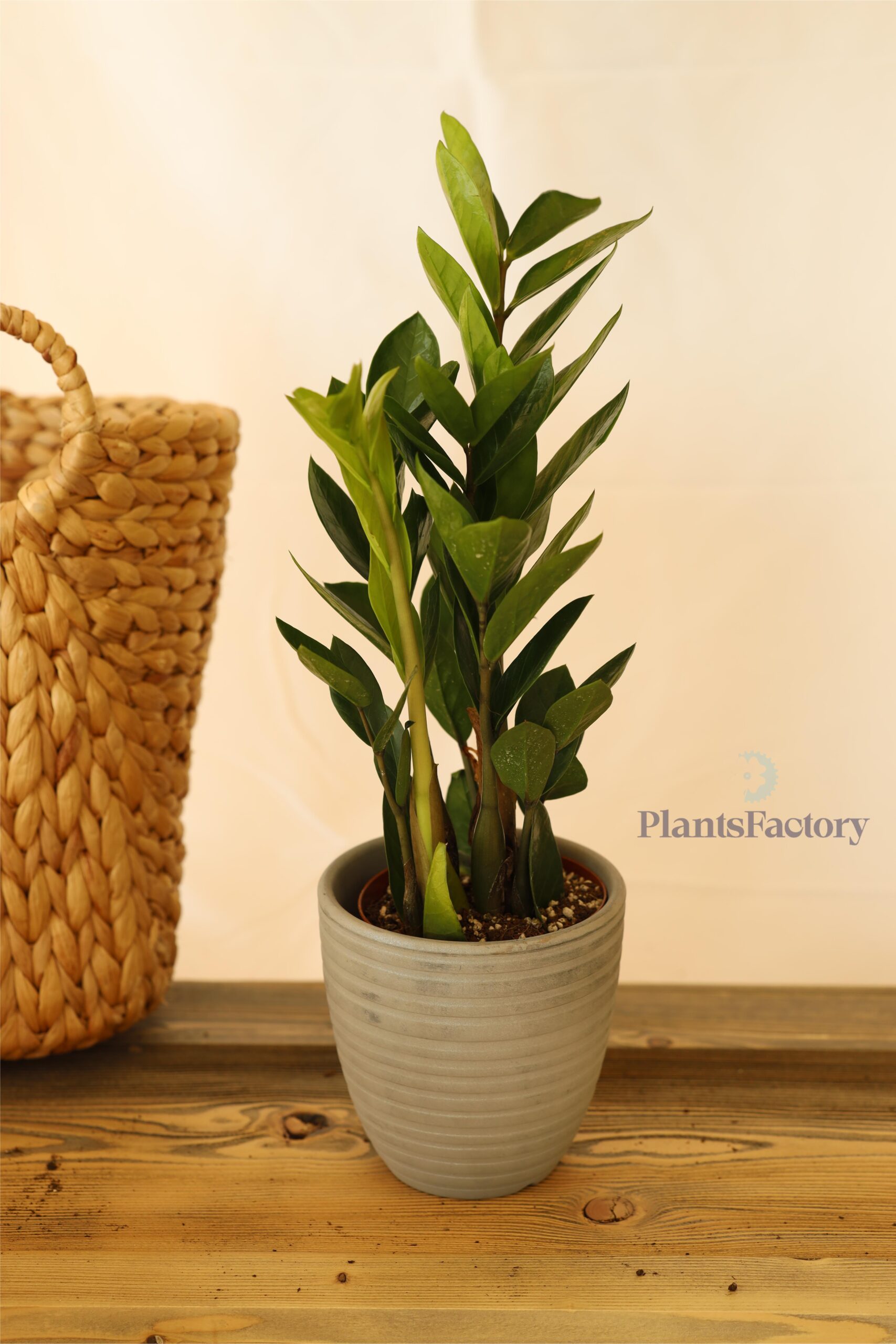 Zamioculcas Zamifolia also known for ZZ Plant in a 40 cm pot with a 12 cm height is a compact, easy-care houseplant with glossy, dark green leaves. Known for its resilience, it thrives in low light and requires minimal watering, making it perfect for indoor spaces with little natural light or busy environments.