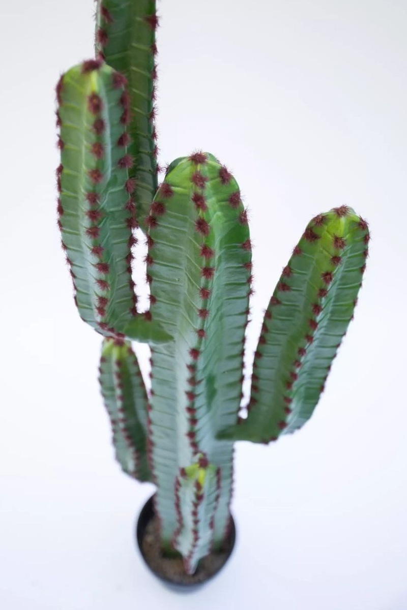 Bring a touch of the desert to your space with the highly realistic 115cm Artificial Cereus Cactus. This stunning piece features massive ribbed stems with natural branching along the entire length and characteristic horizontal stripes for an authentic look. It is detailed with short red needles made of ultra-thin plastic, providing a realistic appearance without the prick. Firmly planted in a black technical pot, this durable piece is ready to effortlessly elevate your interior decor.
