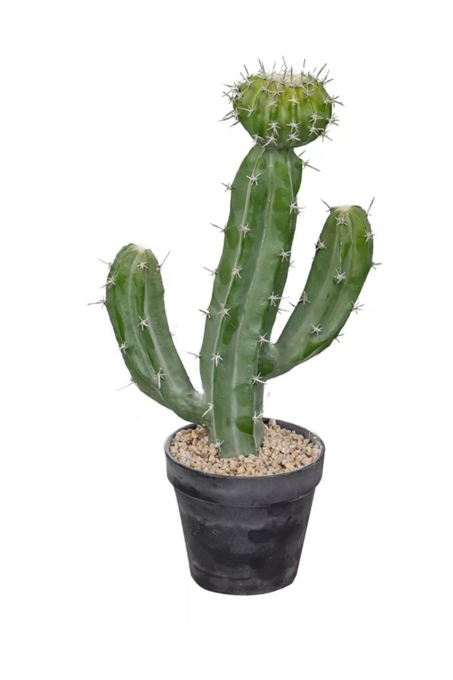Add a touch of unique desert style to your space with this 41cm Artificial Cereus Validus Cactus. This non-separable piece features characteristic cylindrical ribbed stems and a distinctive rounded “cap” on the central trunk. It boasts incredibly realistic details, including a lifelike dusty coating and protruding light PVC spines that mimic a real cactus while remaining completely safe to the touch. It comes firmly planted in a black technical planter, beautifully finished with a securely glued layer of sand-colored pebbles for a polished, maintenance-free aesthetic.