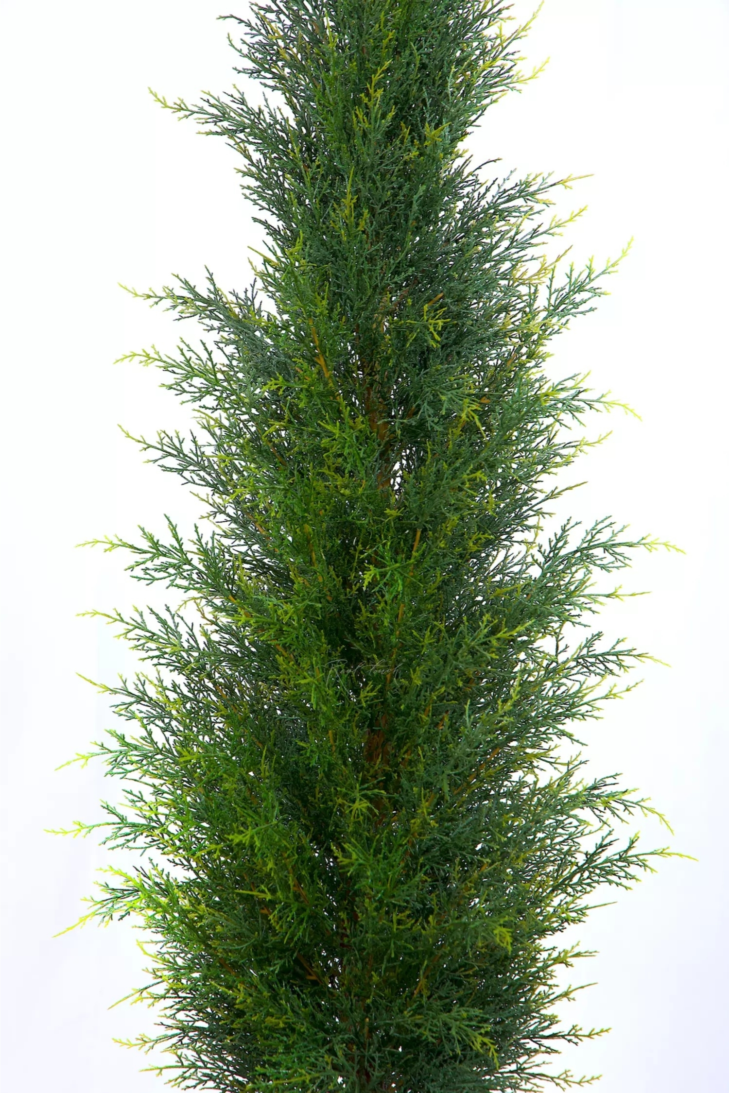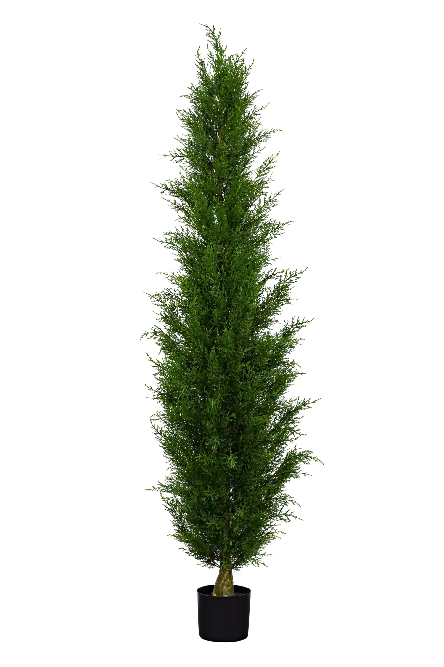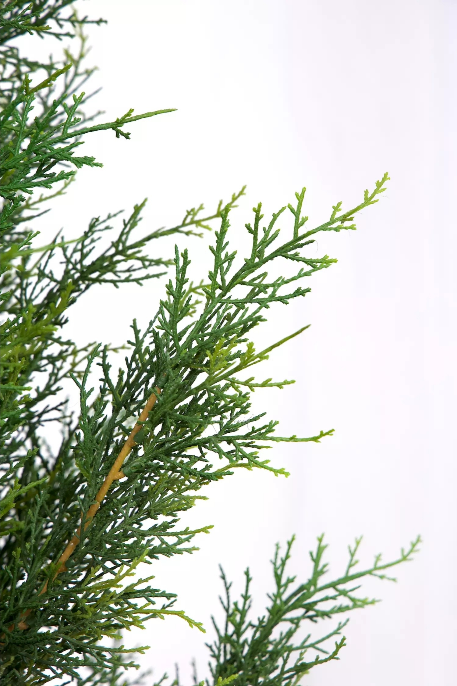 Add a touch of timeless, structured greenery to your indoor or outdoor space with this highly realistic, grand Artificial Western Thuja. It features a beautifully neat, narrow pyramidal crown with a subtle, lifelike thin grey-brown trunk visible at the base. The dense, shiny scaly needles mimic natural growth with an authentic color transition from deep dark green to vibrant light green at the tips. Specially crafted from high-quality plastic infused with UV-resistant properties, this zero-maintenance tree is protected from color fading, ensuring longevity even in sun-exposed outdoor settings. It looks spectacular standing on its own or styled harmoniously in a matching set.